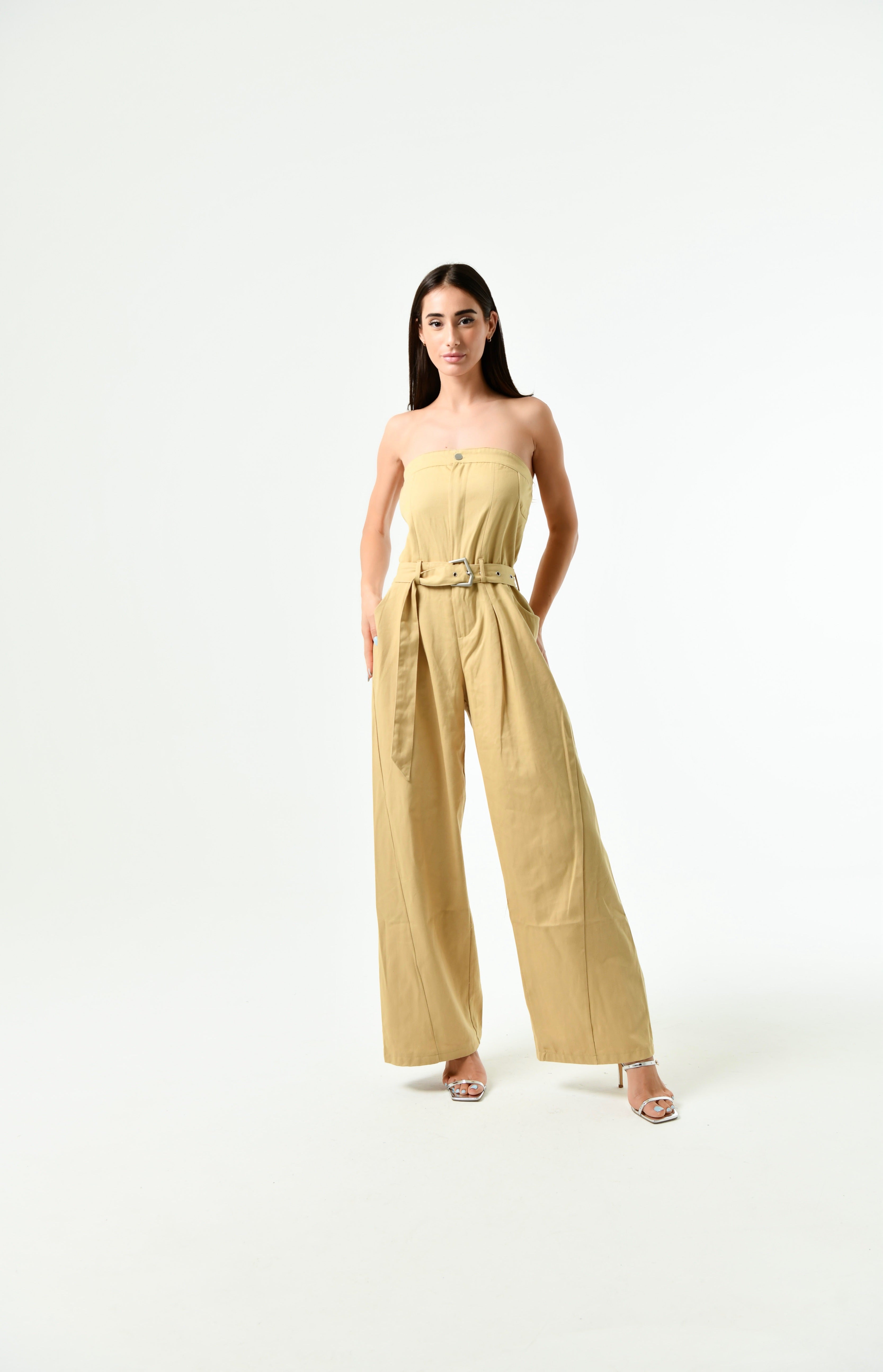 Elegante jumpsuit senza spalline in tessuto leggero color sabbia.